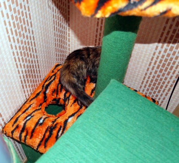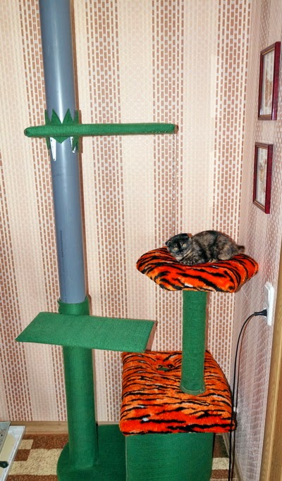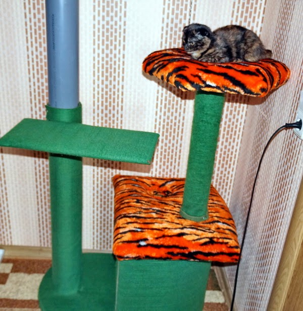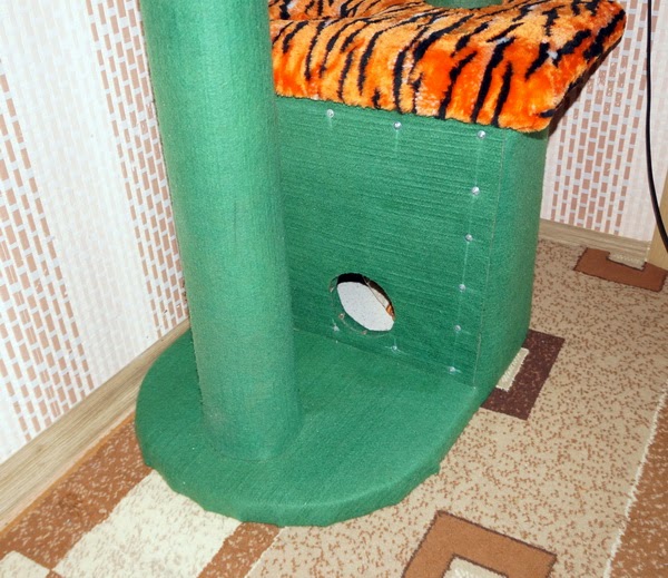 В основе домика кусок столешницы, который был вырезан из-под мойки. Пластиковая канализационная труба держит полочки из ламината и какой-то мебельной доски. Сам домик - "конуру" - сделали из деревянных брусков и обернули ДВП. Крашка домика - выдвижная полочка под клавиатуру. Она давно без дела валялась, наконец-то приспособили. На крышку прикрутили бревно, а сверху невесть откуда взявшуюся шестиугольную доску. Обтянули старым зеленым ковром, кое-где сделали мягкие сидения из ватина и обтянули их искусственным мехом под тигра. Получилось очень здорово. Кошка оценила. :)