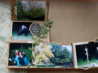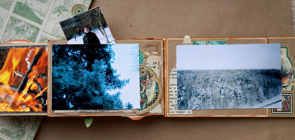 Эта история рассказана в моем мини-альбомчике. Сделан он из одного листа кардстока, плюс кусок на обложку. Для подложек - крафтбумага и листы из старой книги. Немного чипборда, вырубки с веточками и вырезалок из Graphic45 Enchanted forest. В альбочке 26 фото размером от 6,5х6 см до 6,5х10,5 см. Все фото были либо сделаны на пленочную мыльницу, а затем отсканированы, либо на весьма плохонький цифровик, так что качество изображений оставляет желать лучшего, но как память - они бесценны.