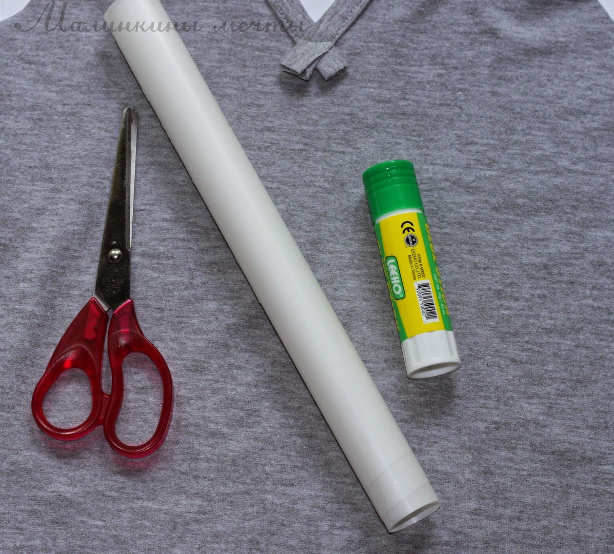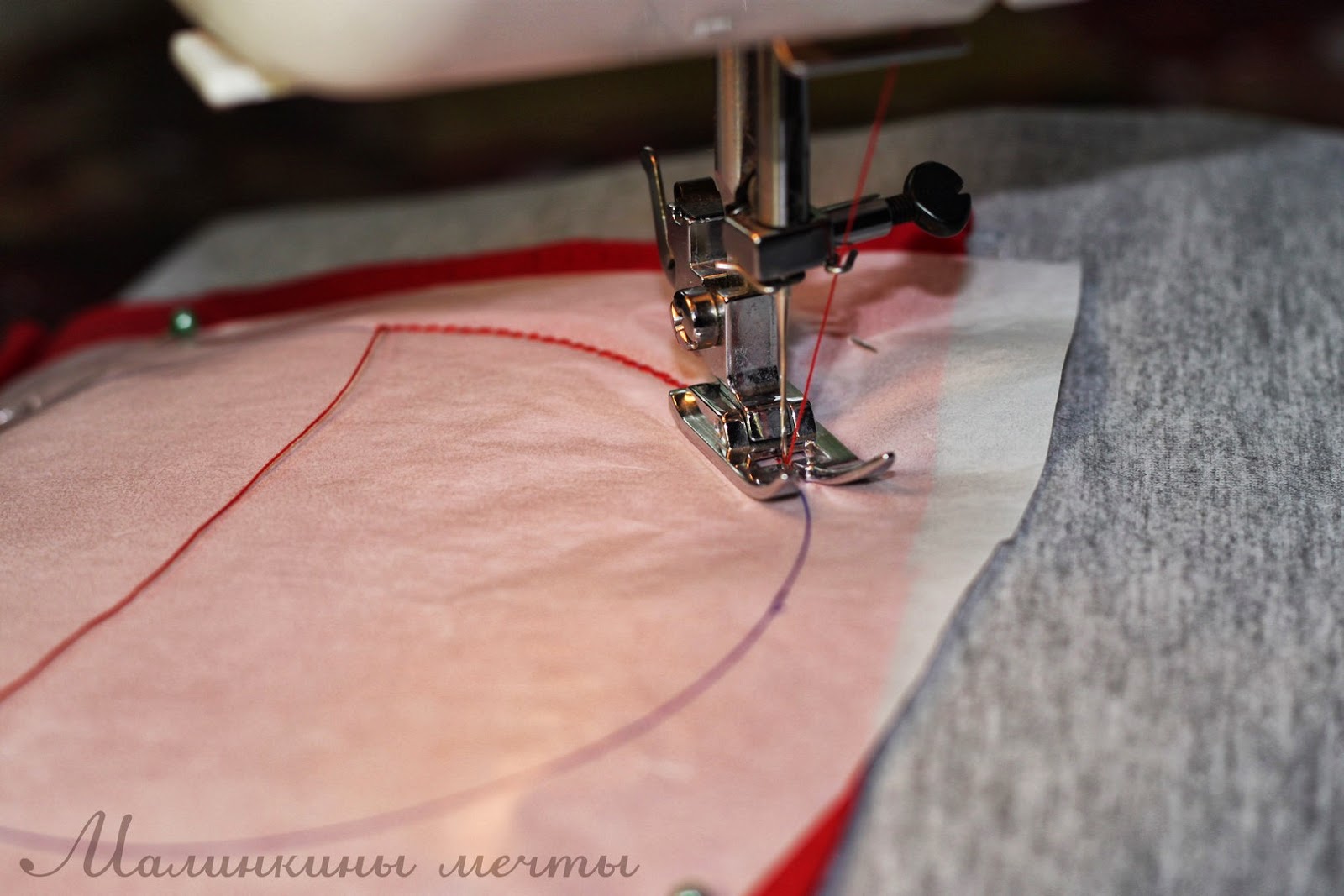 Когда все элементы готовы, можно браться за "жертву" =) Для аппликации на трикотаже обязательно надо закрепить изнанку. Иначе, из-за тянучести трикотажа все поплывет. Для закрепления можно использовать клеевой флизелин. Причем, практика показала, чем хуже флизелин по качеству, тем лучше для нас =) Надо легонько прогладить его утюгом, чтобы он СЛЕГКА приклеился. Это важно. Если флизелин приклеится намертво, то все, - хана. Его потом ничем не отдерешь. Дочка уже год ходит в кофточке, где на аппликации до сих пор обрывки флизелина, которые я не смогла отодрать. Ни стирки, ни целенаправленное отдирание ему ни по чем. А в последнее время я для закрепления изнанки использую обычную кальку и клей-карандаш.