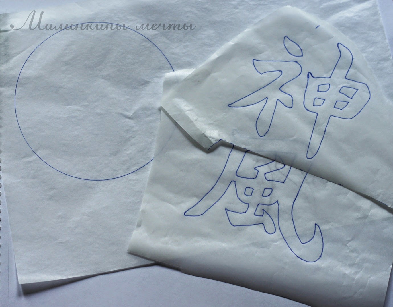 Для начала надо определиться с рисунком. Отрисовать его на бумаге. Для многоцветных аппликаций я делаю цветной эскиз на бумаге, с раскладкой по цветам. Например, как здесь. Потом, перевожу его на кальку. Сейчас у меня в работе двухцветная аппликация, поэтому эскиз сразу рисовала на кальке, без "цветного" этапа.