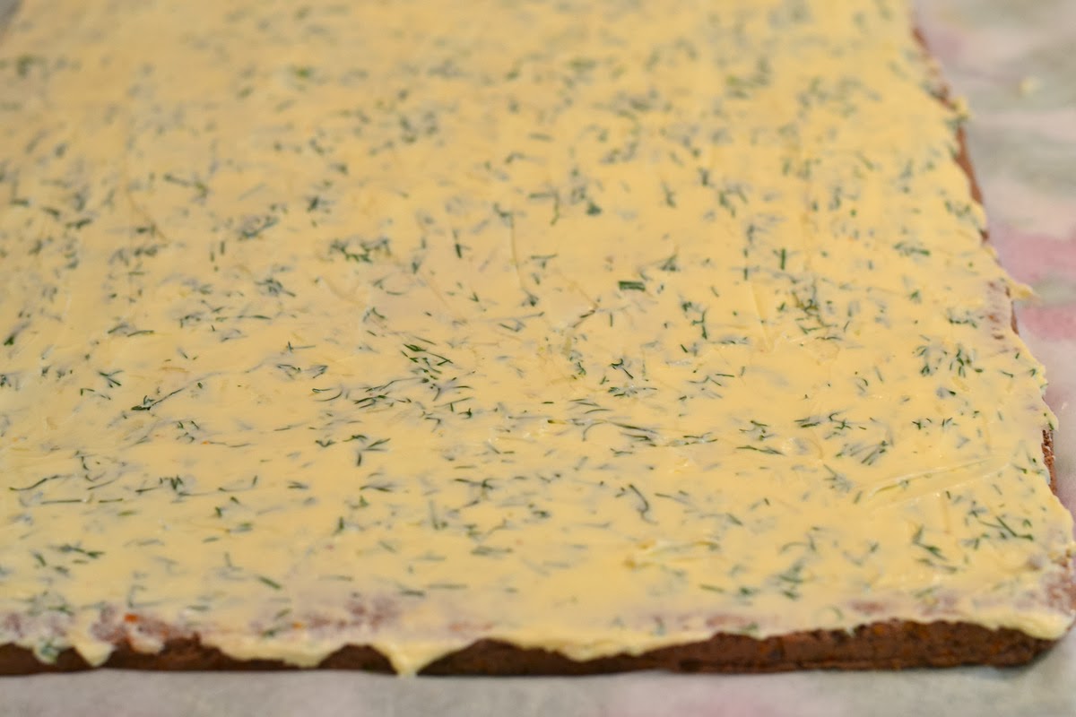 На верх фарша выложить начинку, ножом выровнять, слой сливочного масла должен быть как можно тоньше.