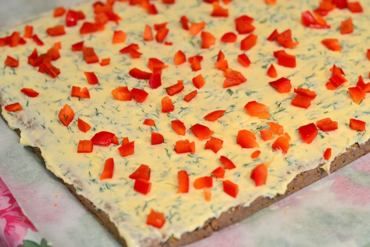 Порезать на маленькие кубики красный перчик и сверху его выложить.