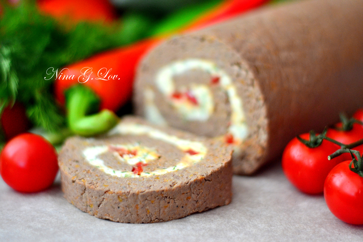 Теперь самое важное, собрать рулет в рулет))) Выложить на пергамент фарш ложкой и начинать разравнивать чистыми руками в прямоугольник, хорошо утрамбовать, выровнять все стороны ножом.