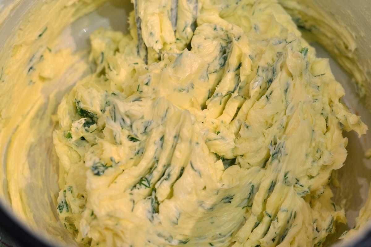 Готовим начинку. Масло комнатной температуры разминаем вилкой,добавляем тертый на мелкой терке или выжатый в чеснодавилке чеснок, мелко порезанную зелень и все перемешиваем до однородности.