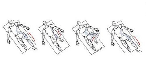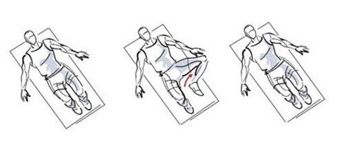 1. Лягте на пол и согните ноги в коленях. Ступни должны полностью стоять на полу недалеко от таза. Отведите левое колено вниз и в сторону так, как-будто пытаетесь положить его на пол. Верните ногу в исходное положение. Повторите так 3 раза из 8. (рис 1)