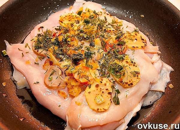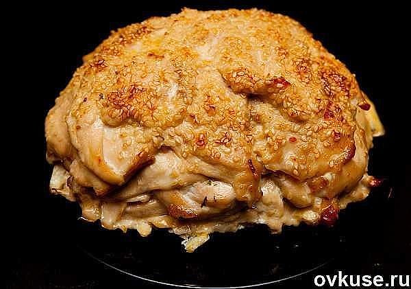Вкуснейшее и оригинальнейшее блюдо - готовится из простых продуктов, а выглядит - как деликатес из шикарного ресторана. Можно делать порционно - одна куриная грудка на порцию, но мне кажется, что вкуснее и сочнее получается, когда всё готовится одним большим слоёным куском.