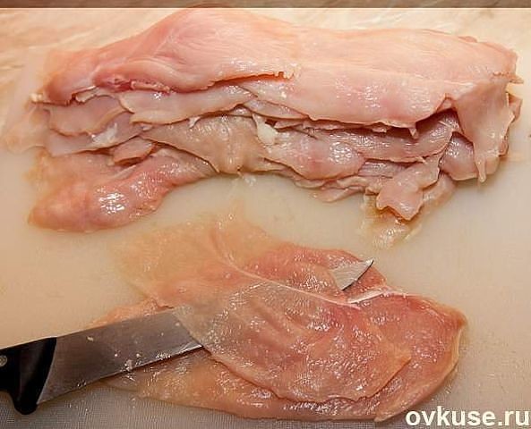 Куриное филе острым ножом нарезаем на пластины, как можно тоньше, поперчить, посолить.