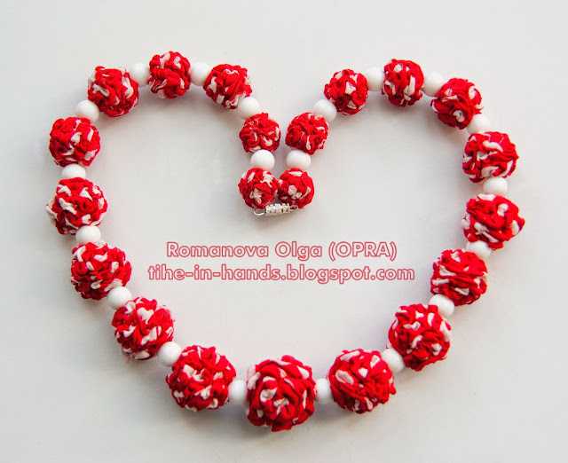 Все свои бусы я собираю на леску, используя для этого толстую иглу. Как вариант их можно собрать на атласную ленту (и завязывать ее бантиком) или может на длинный вощеный шнур, навязав на нем узелки. Бусины могут быть одного размера или абсолютно разных, пестрые или однотонные, а можно нашить на них бисер. Интересный результат получится, если чередовать их с бусинами, обвязанными крючком, стеклянными или деревянными. Вариантов множество...