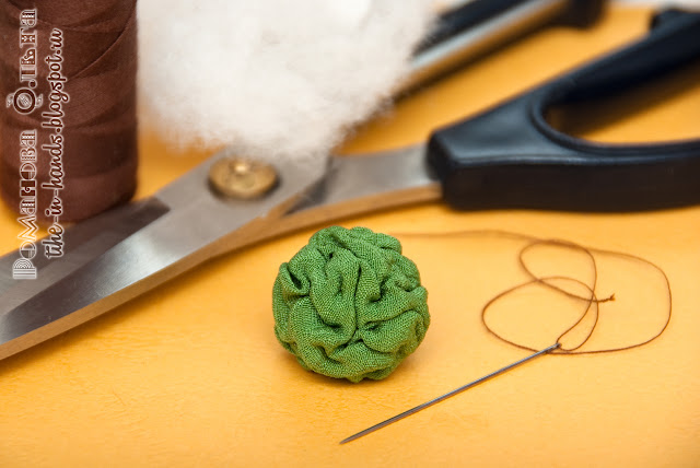 3. Не до конца стягиваем "мешочек" и кладем внутрь синтепон. Свои первые бусы я делала без набивки, но на мой взгляд, так больше расходуется ткани и дольше и труднее придать бусинам круглую форму.