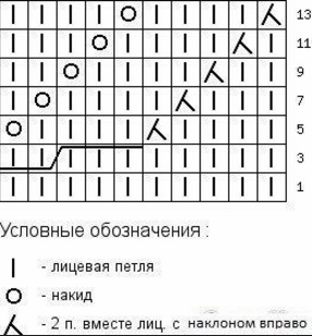 7 ряд: 2 лиц., накид, 4 лиц., 2 петли вместе лицевой с наклоном влево, 4 изн., 2 петли вместе лицевой с наклоном вправо, 4 лиц., накид, 2 лиц., 1 изн.