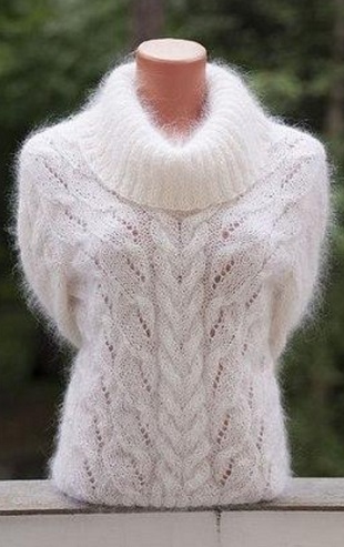 Свитер с нежным узором связан из легкой и мягкой мохеровой пряжи. В центре полочки и спинки свитера мы видим сдвоенную косу. Все остальное полотно свитера связано симметричным и разнонаправленным узором. Широкий воротник-хомут связан резинкой 2 на 2. Успейте связать такой свитер до наступления теплой весенней погоды и насладитесь его уютом и теплой мягкостью. Изделия из мохера следует вязать достаточно свободно. Далее, вы сможете познакомиться со схемой вязания свитера спицами.