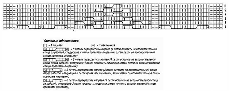 11 ряд: 4 лиц., накид, 4 лиц., 2 петли вместе лицевой с наклоном влево, 2 петли вместе лицевой с наклоном вправо, 4 лиц., накид, 4 лиц., 1 изн.
