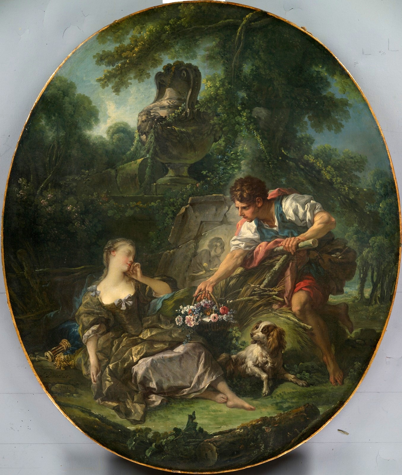 1748_Таинственная корзинка (The mysterious basket)_92.7 х 78.9_х.,м._Мельбурн, Национальная галерея Виктории 1750_Аполлон, раскрывающий свое божественное происхождение пастушке Иссе (Apollo Revealing his Divinity to Isse)_129 х 157.5_х.,м._Тур, Музей изобразительных искусств