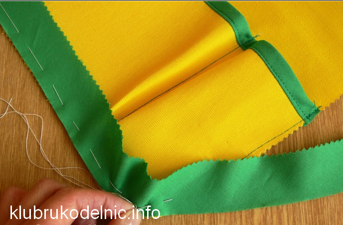 7. Углы скатерти закруглим и пришьем кант. Опять нарежем по косой ткань для окантовки на полоски шириной 4 см, приметаем и пришьем с лицевой стороны. В закругленный местах кант слегка присборим, чтобы не стягивался шов в уголках.