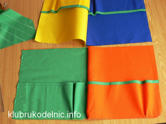 2. Карман должен быть свободным, чтобы в него можно было положить пластмассовые тарелки и приборы. Выкроим из оранжевой, синей, желтой и зеленой ткани четыре квадрата и четыре кармана.