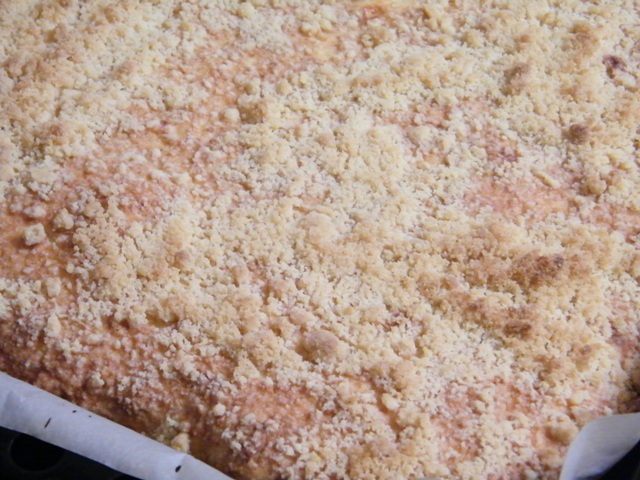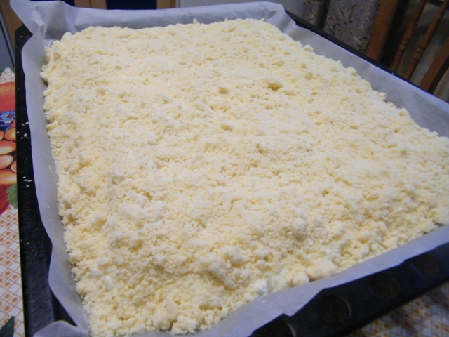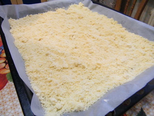 Муку, маргарин, соду и оставшиеся 12 столовых ложек сахара перетереть в мелкую крошку.