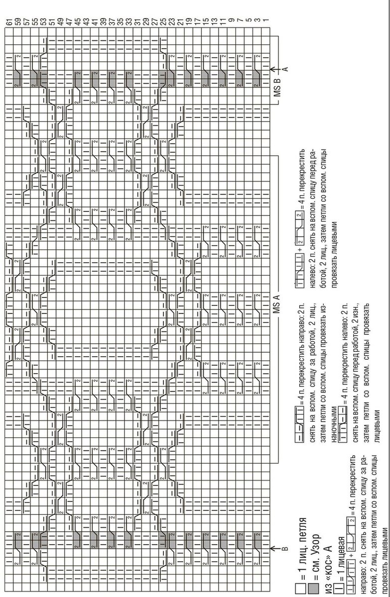 Количество петель кратно 36 + 30 (20) п. + 2 кром. Вязать по приведенной схеме. На схеме даны только лицевые ряды. В изнаночных рядах петли провязывать по рисунку.