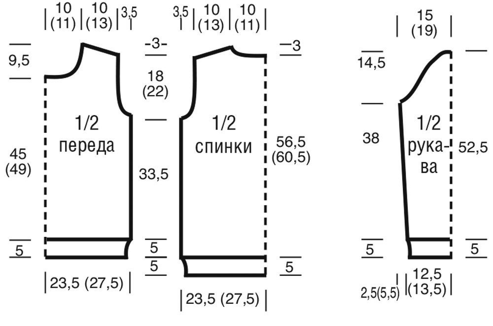 Вязать, как перед, но нижнюю часть спинки до начала пройм выполнить на 5 см длиннее. Для этого после нижней планки вязать по схеме с 1-го по 16-й р. 2 раза.