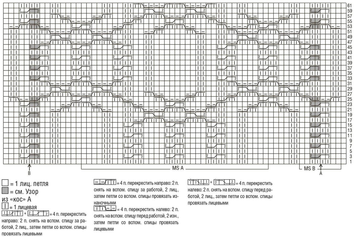 Количество петель кратно 8 + 2 кром. Вязать по той же приведенной схеме, повторяя между кром. раппорт В. В высоту повторять с 1-го по 4-й ряд.
