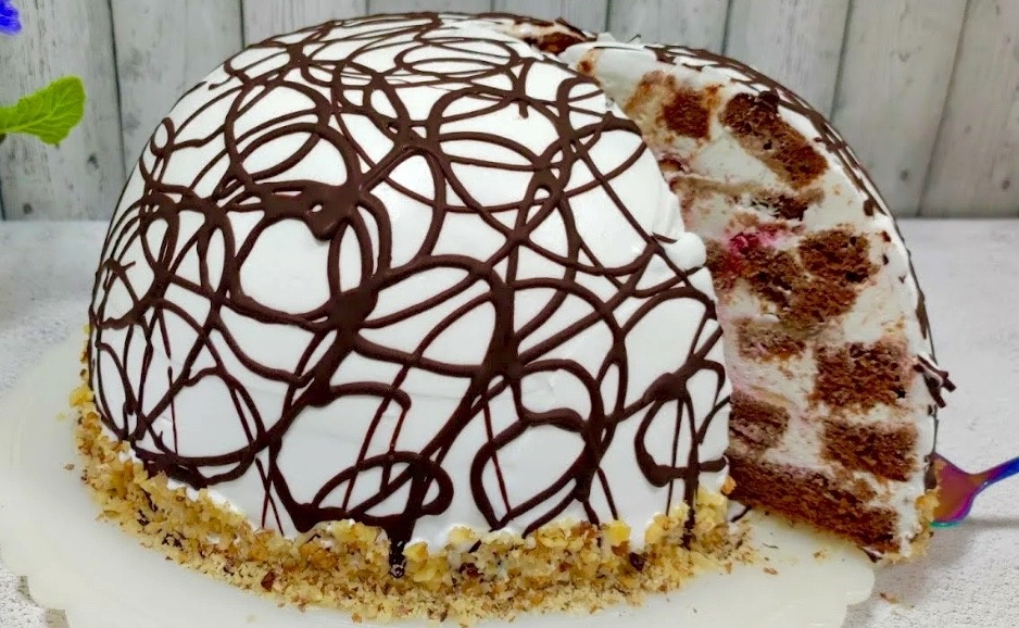 Растопите шоколад вместе с маслом на водяной бане или в микроволновке. Украсьте поверхность торта растопленным шоколадом. Можете сделать спиралевидный рисунок или подтеки. При желании вы можете украсить поверхность торта рубленными орешками. Готовый торт храните в холодильнике.