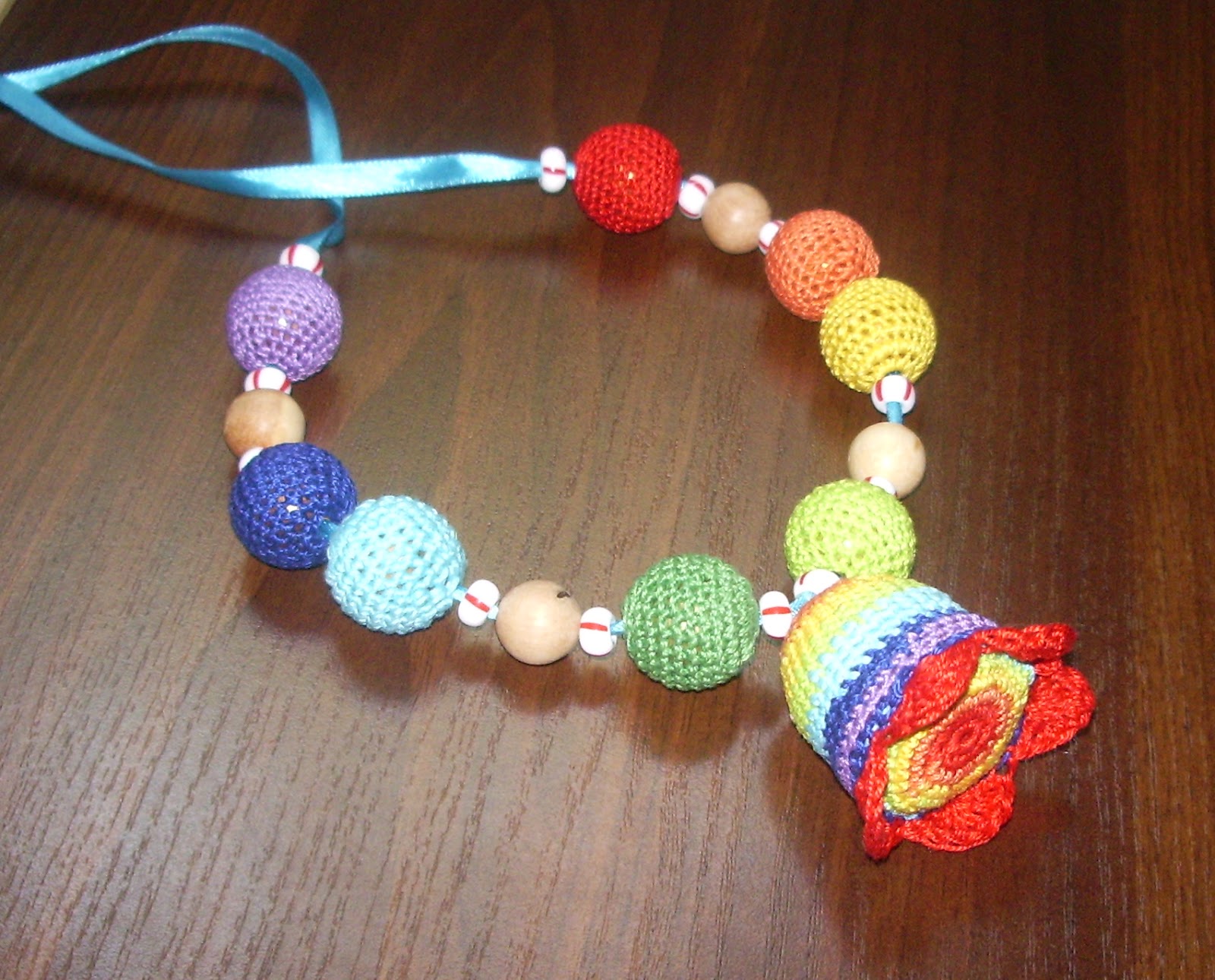 Состав: деревянные и пластиковые бусины разных размеров, пластиковая погремушка, чешский бисер, атласная лента, 100% мерсеризированный хлопок.