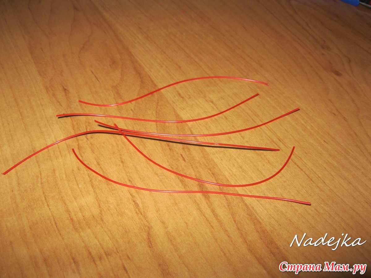 При вязании 3-го ряда я использовала тонкую проволоку, она у меня желтая и красная.