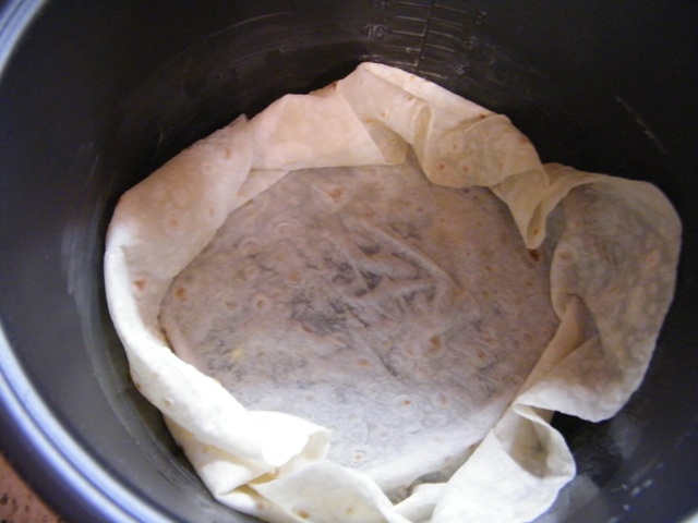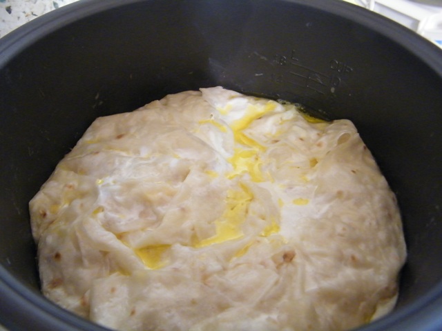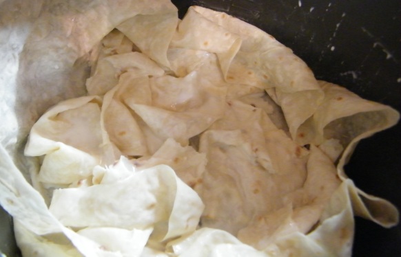Кастрюльку смазать маслом, выложить лист лаваша, края приподняты