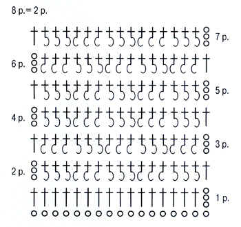 Число петель кратно 3 + 2 кромочные, т.е. в начале ряда - 3 в.п., в конце - обычный столбик с накидом. Первый ряд вязать столбиками с накидом. Второй ряд начать с 3 возд. петель подъема, далее повторять раппорт *3 лицевых рельефных столбика, 3 изнаночных рельефных столбика*, закончить ряд столбиком с накидом. Далее чередовать столбики в шахматном порядке.