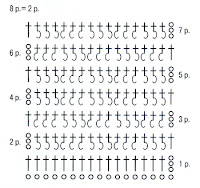 Ряд 11, 13, и 15: 2 лиц, *(1 лиц, 1 изн) 2 раза, 3 лиц; повт. от *