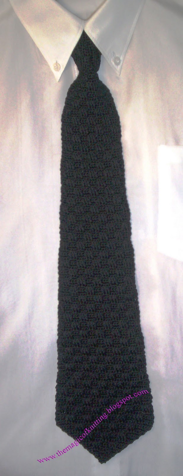 Таким узором я как-то вязала брату галстук из вискозы, расчеты не делала, просто прикладывала к обычному галстуку. Прошу прощения за качество фото, давно дело было: