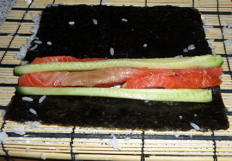 На лист водорослей нори, который мы не забыли положить гладкой стороной вниз,