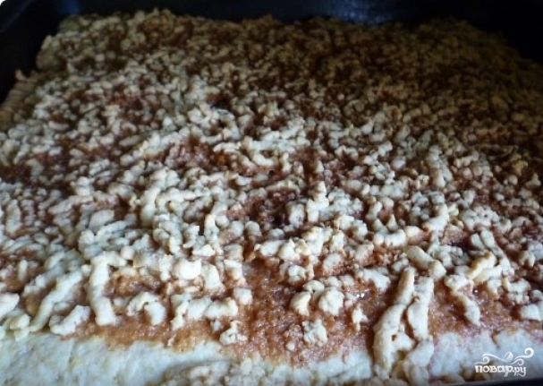 8. Вилкой сделать в тесте проколы, чтобы оно не поднималось в процессе выпечки. Намазать пласт вареньем по вкусу или джемом. Достать тесто из морозилки и натереть на терке, распределяя по всей поверхности.