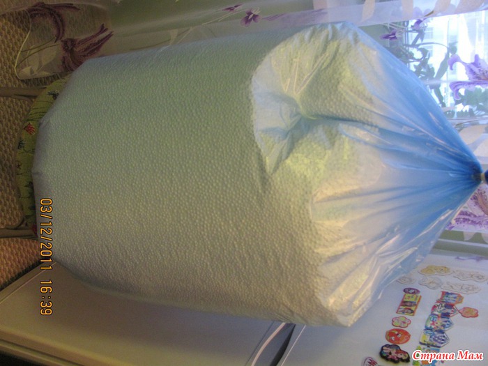 Я выяснила, что полистирол хорошо держит форму в мешках, поэтому снеговика решила делать на основе цилиндра, немного к верху зауженого, а дно оставила как основу. Где нужна шея - просто завязывается шнурком. Получилось довольно симпатично, а самое главное - легко