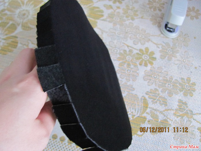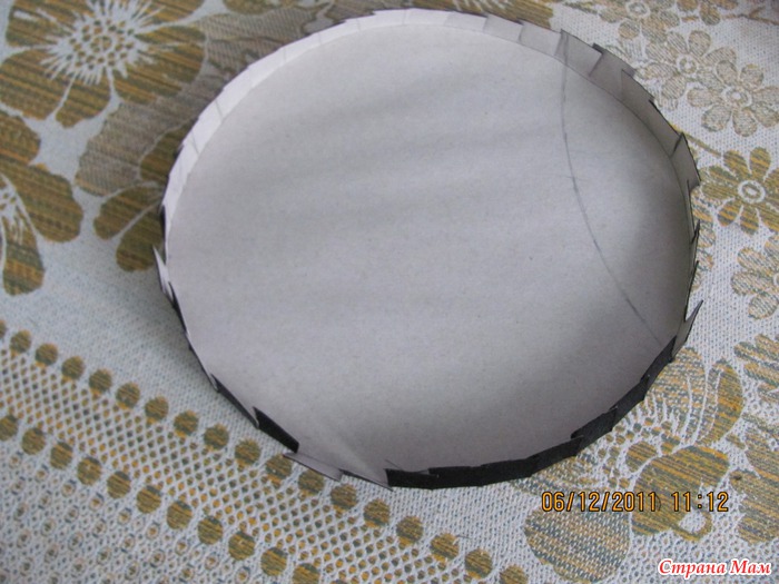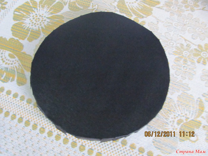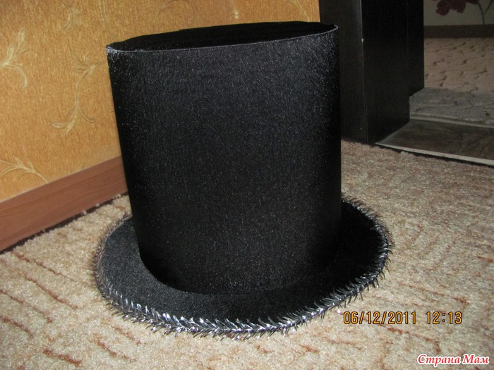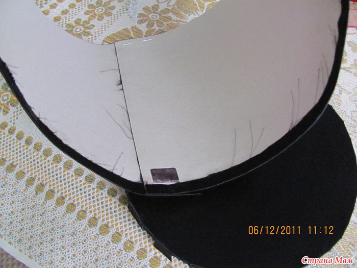 Вырезаем из обычного картона(я купила формата А1) основу шляпы - дно, тулья и поля. Затем обклеиваем их креп-сатином(на ПВА). Когда высохнет, продолжаем собирать шляпу.