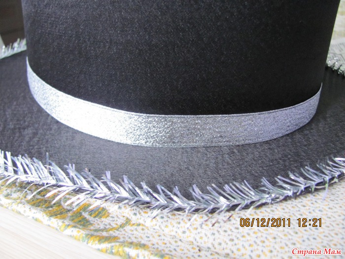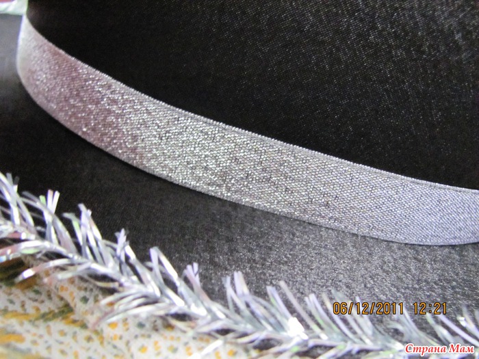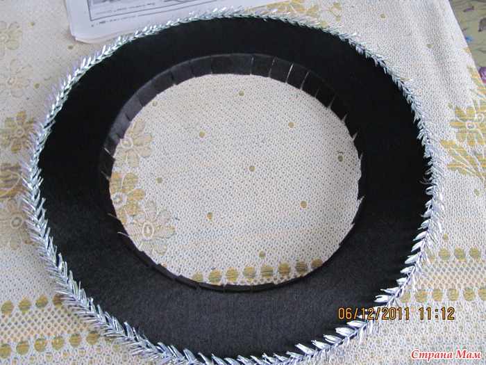 Для нарядности декорируем серебристой лентой место склеивания и обшиваем мишурой поля