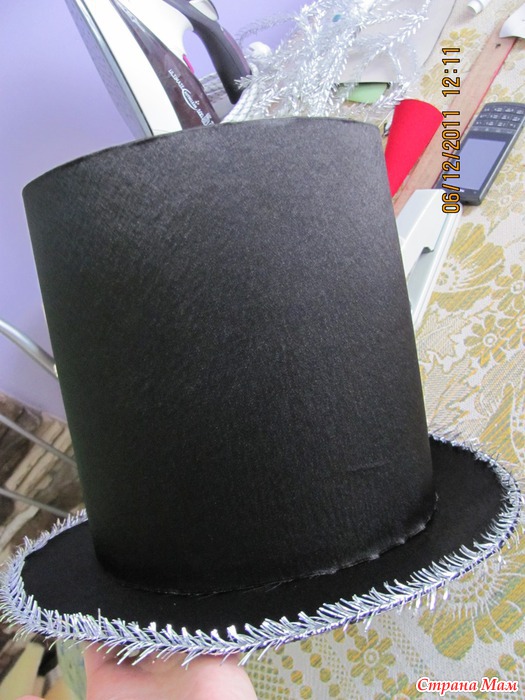 Для начала, была куплена бязь - 2 метра, черный креп-сатин- 0,5метра, провод для рук, картон для цилиндра и клей ПВА и Момент. Остальное было у меня дома:поролон, перчатки, картон коробочный, мишура, клеевая, дублерин, нитки капроновые белые.
