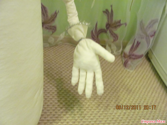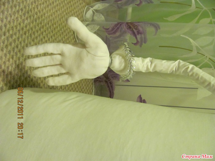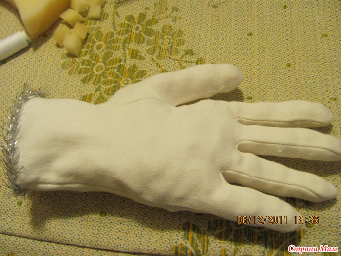 Доделываем руки - набиваем перчатки поролоном и обшиваем края мишурой.