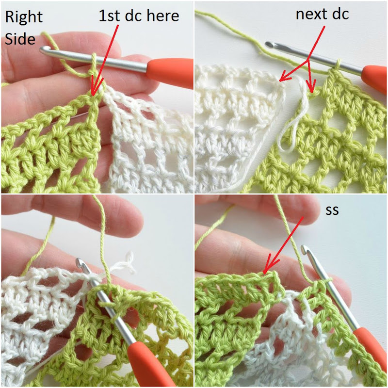 22 ряд: как 2 ряд. Соединить детали переда и спинки вместе лицевыми стороны друг другу, изнанкой наружу и выполнить соед. ст. в 3-ю возд.п. из 5-ти петель угла (нижнего) по переду для соединения переда и спинки, повернуть вязание.