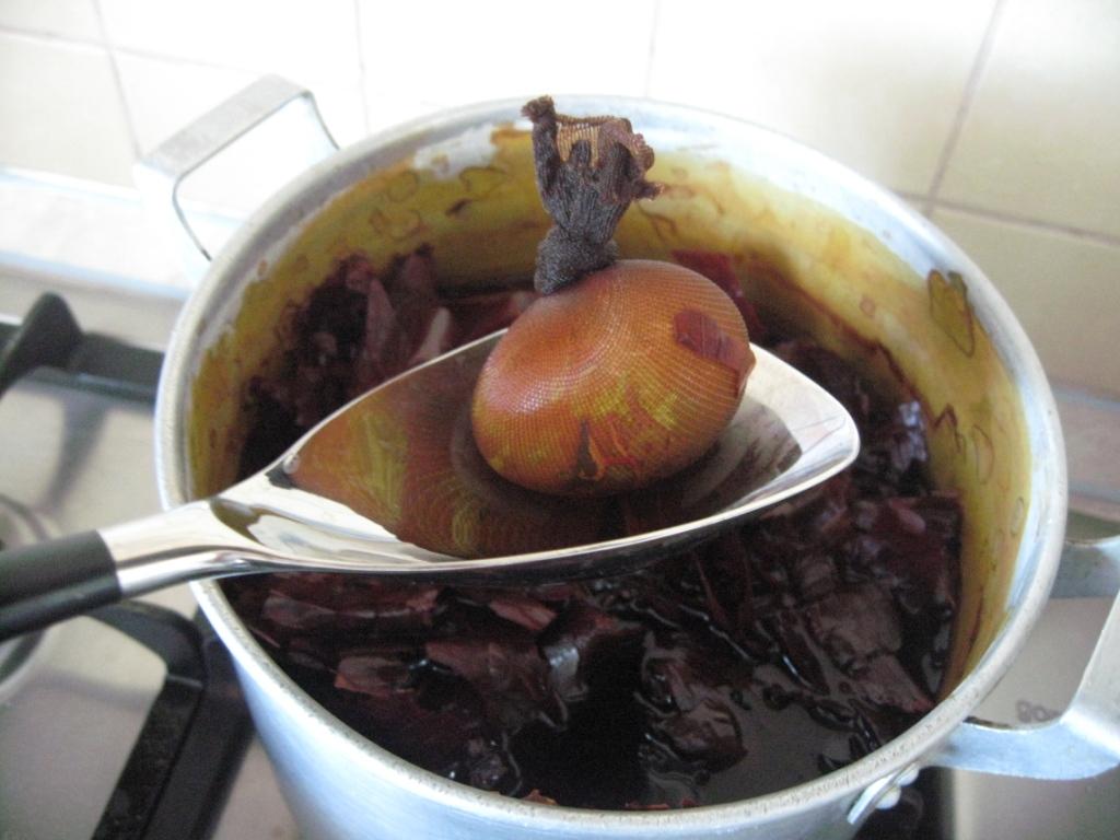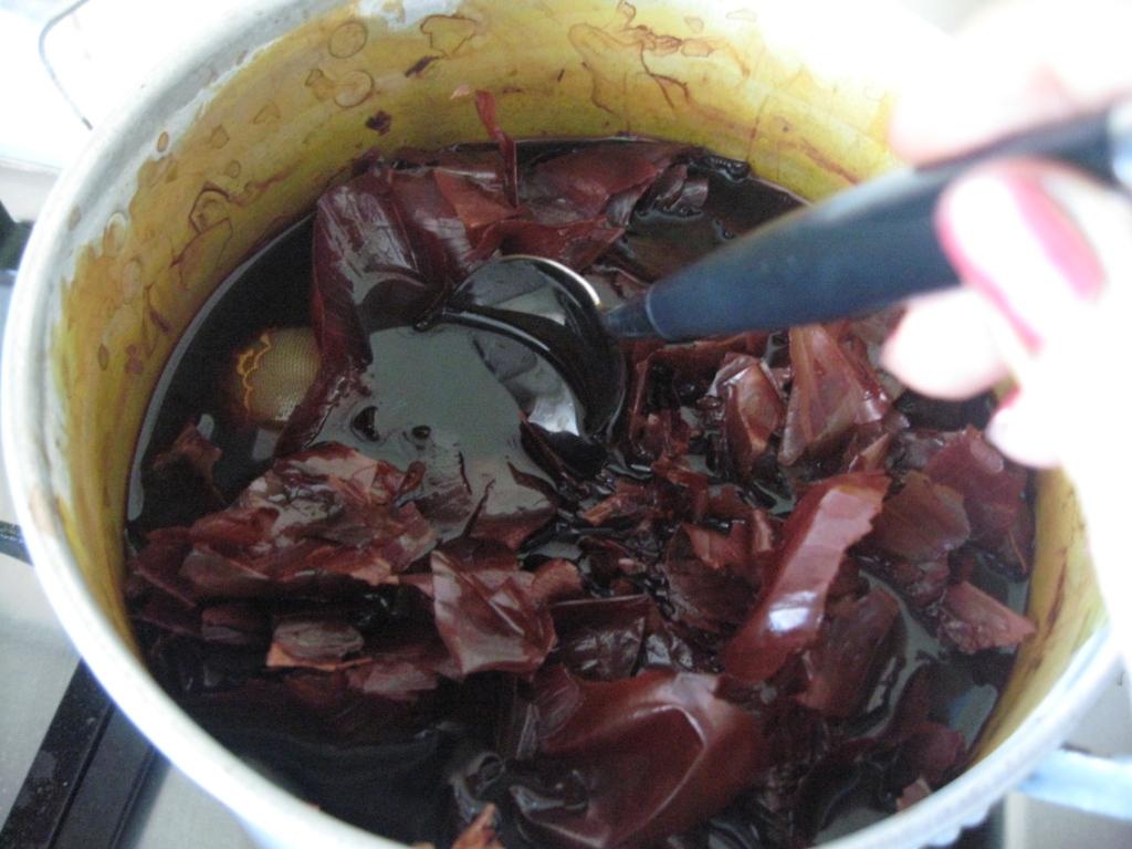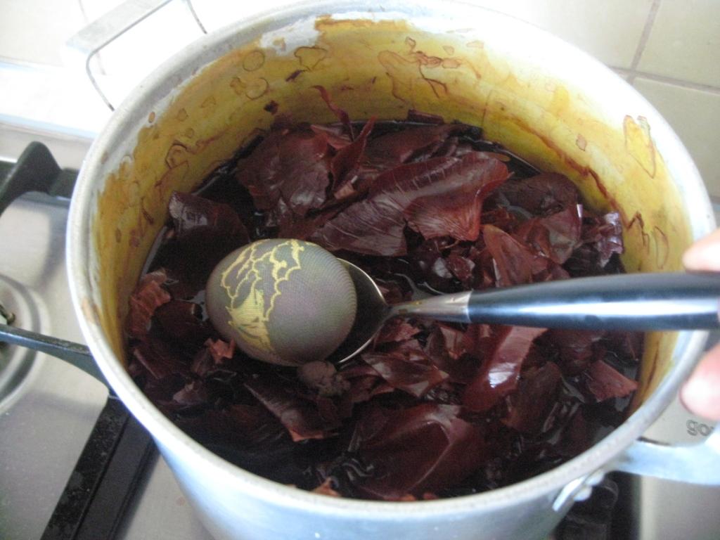 Теперь опускаем яйки в луковую шелуху. Она подостыла и яйки не треснут, а главное, можно следить за цветом. Напоминаю, яйца я сначала отварила, потом начала красить.