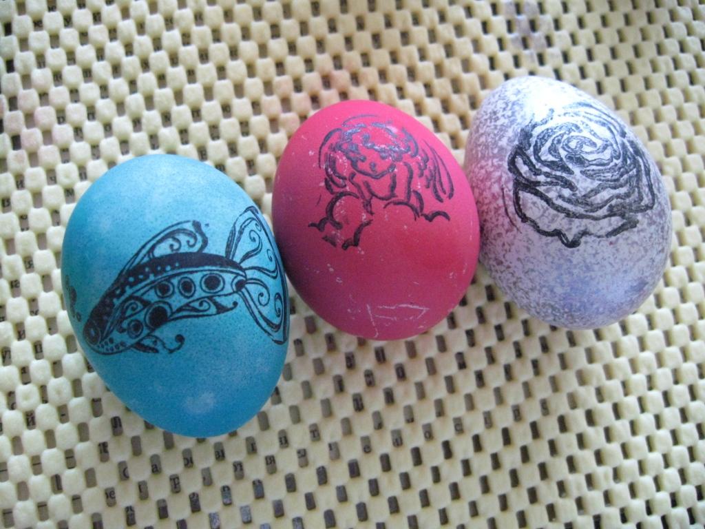 А это контур :) яйки красила по тому же принципу, сначала в одной краске, затем из плотной бумаги вырезала крылышки бабочек, замотала в капрон и опустила в другую краску, затем обвела контуром.