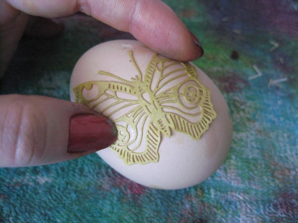 Затем, как наша вырезка немного намочилась - прикладываем на яйцо и аккуратненько распределяем пальцами