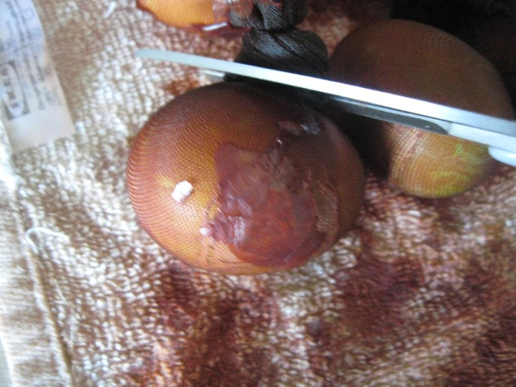 И сразу же начинаем освобождать яйки из плена капрона. Не знаю почему, но как-то с детства в памяти отложилось, что если дать в таком состоянии яйкам отстыть, то капрон потом ничем не отскребёшь :) так мама говорила :) сама не пробовала, потому что сразу снимаю отработанный материал :)