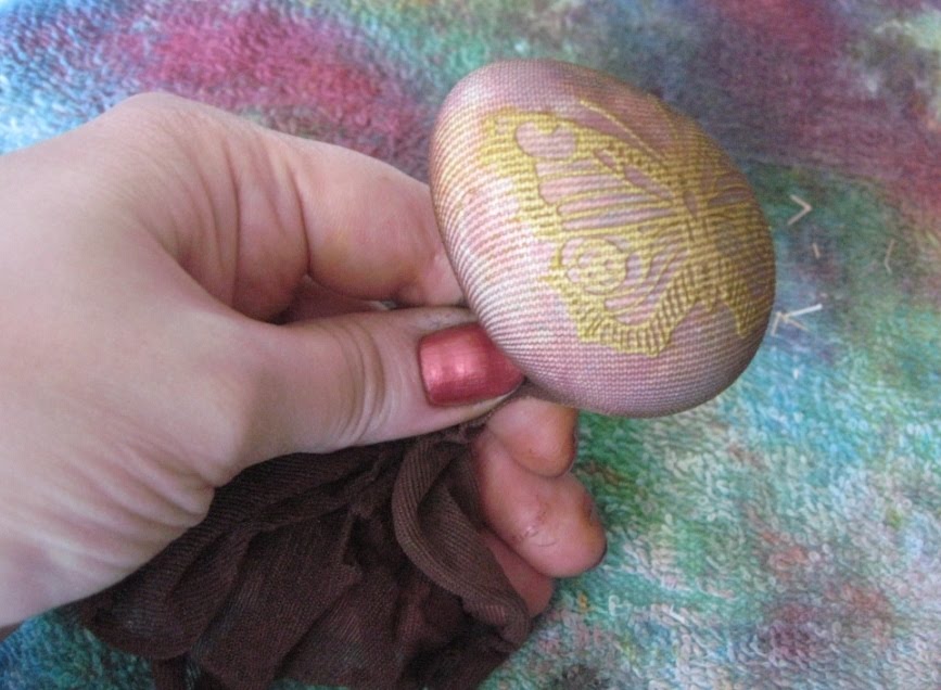 Теперь самая главная часть. Очень аккуратно вкладываем яйцо внутрь кусочка от колготки и натягиваем на другой стороне яйца, за одно аккуратно подправляем рисунок. На самом деле это очень просто, ведь колготки эластичные и сами натягиваются и всё расправляют.