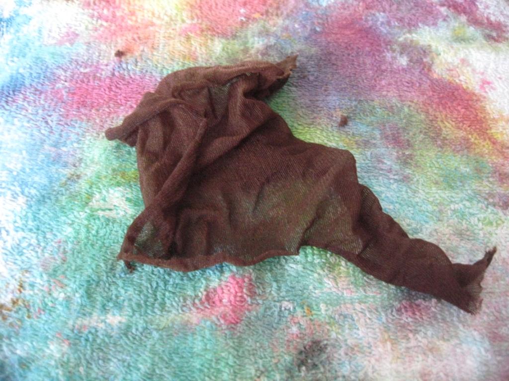 И самое главное :) не нужные, старые, рваные тонкие капроновые колготки. Их нужно разрезать на небольшие кусочки (из одной пары колготок у меня получается 8-12 кусочков) не стоит делать маленькие отрезки, потому что потом будет трудно их завязать, кстати, колготки я собираю целый год :)))