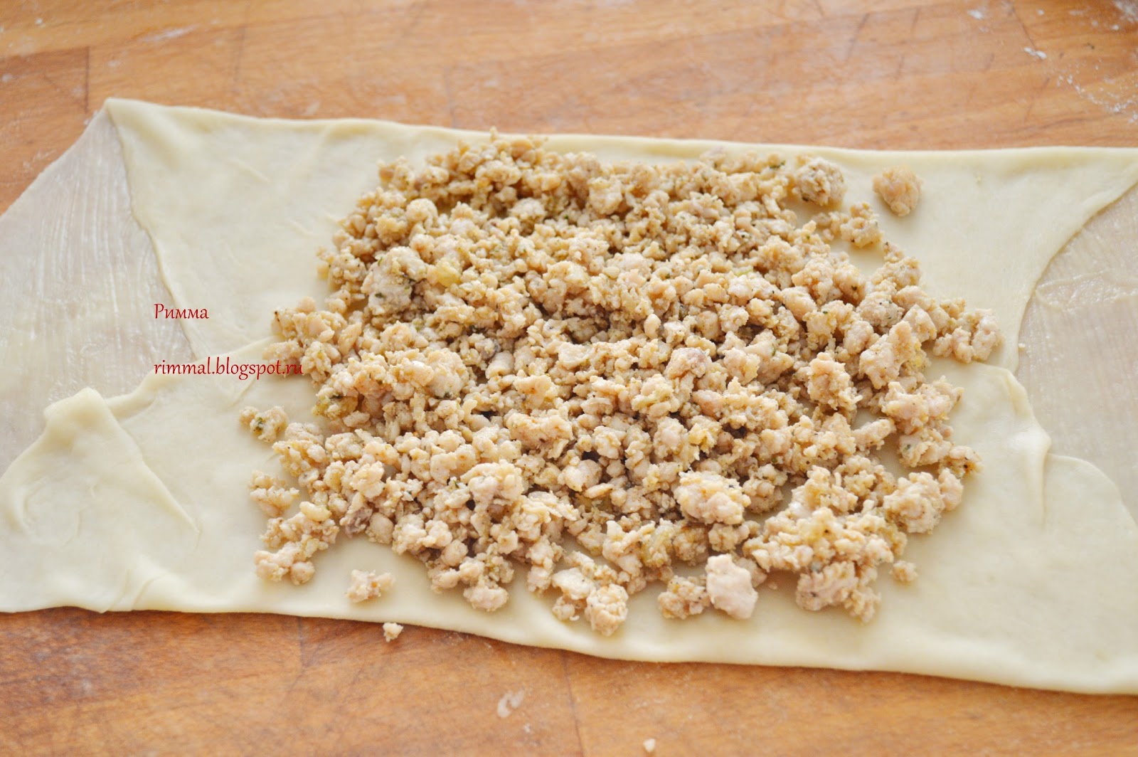 Закройте двумя другими сторонами начинку. У вас получился конверт) Прижмите немного руками или раскатайте скалкой.