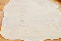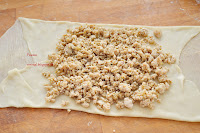 Смажьте поверхность теста растопленным сливочным маслом. Сверните две противоположные стороны так, как показано на фото: одна сторона должна ложиться внахлест на другую.