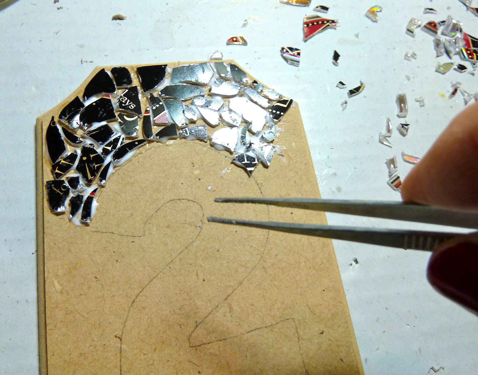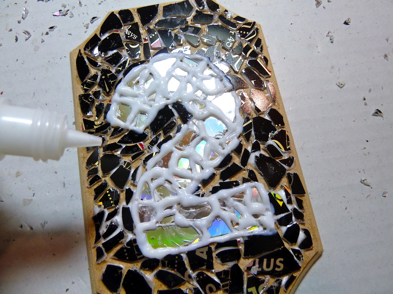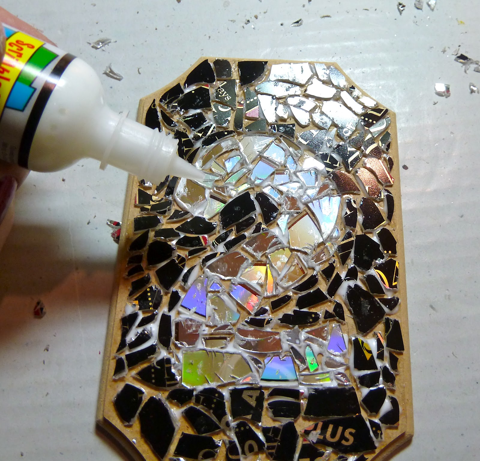3. Нарежьте CD на мелкие кусочки старыми ножницами. Используйте пинцет, чтобы подбирать куски и постепенно смазывая области приклеивать кусочки оставляя небольшие пространства между ними. Заполните сначала фон темными кусочками. После того как вы заполнили всю область фона, введите номер с блестящей стороны диска. Пусть клей полностью высохнет .