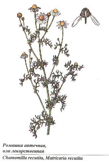 А на сайте описывают такую точку зрения. Действие и применение. Настой цветочных корзинок ромашки оказывает противовоспалительное, кровоостанавливающее, антисептическое, слабое вяжущее, болеутоляющее, седативное, противосудорожное, потогонное, желчегонное действие. Эфирное масло ромашки обладает дезинфицирующим и потогонным действием, уменьшает образование газов, снимает боли, ослабляет воспалительные процессы, нормализует нарушенную функцию желудочно-кишечного тракта, возбуждающе действует на центральную нервную систему: усиливает и учащает дыхание, увеличивает число сердечных сокращений, расширяет сосуды головного мозга. Большие дозы эфирного масла вызывают головную боль и общую слабость. Гликозид увеличивает выделение желудочного и кишечного соков; усиливает желчеотделение и возбуждает аппетит. Апиин, апигенин и герниарин оказывают умеренно спазмолитическое действие. Хамазулен обладает выраженным противовоспалительным, противоаллергическим, местноанестезирующим действием, усиливает регенеративные процессы. Хамазулен и его синтетические аналоги находят применение при лечении бронхиальной астмы, ревматизма, аллергических гастритов и колитов, экзем, ожогов рентгеновыми лучами и других заболеваний. Хамазулен переходит в настой, но при кипячении частично разлагается. Настой цветочных корзинок применяется внутрь при спазмах кишечника, гастритах, энтеритах, метеоризме, при воспалении печени и желчного пузыря, почек, мочевого пузыря, дисменорее, при истерии, неврозах и судорогах, невралгиях тройничного нерва. Наружно как вяжущее антисептическое, противовоспалительное средство в виде полосканий, примочек, ванн и лечебных клизм. Болгарские ученые отмечают особую ценность ромашки как целебного средства, подтвержденную фармакологическим и клиническим изучением ее. Они отмечают, что действие ее стойкое и наиболее благоприятное при лечении острых и хронических гастритов, язвы желудка, колита, а также при повышенной возбудимости, невралгических болях, болезненных менструациях, маточных кровотечениях и др. Наружно это растение применяют для промывания воспаленной слизистой оболочки при геморрое, для ножных ванн при потливости ног. При лечении гриппа рекомендуется вдыхать пары горячего настоя ромашки. Индийские целители утверждают, что ромашка эффективна и для лечения половой сферы — как у мужчин, так и у женщин. Если сок ромашки смешать в пропорции 1:1 с соком тысячелистника и принимать по половине чайной ложки два раза в день, то можно преодолеть даже импотенцию. Во Франции настой ромашки применяется при расстройствах пищеварения, при переутомлении, физической перегрузке, пересыщении кофе и табаком, при плохом самочувствии и лечении простуды. В аптеках Франции имеется ромашка в пакетах-фильтрах, каждый пакет (6 г) — дневная доза. Пакет-фильтр с ромашкой надо опустить в чашку, в которую медленно вливают кипяток. Через 5 минут необходимо помешать ложкой. Через 20—30 минут пакет-фильтр вынуть. При желании можно добавить сахар (для приема внутрь). В аптеках имеются пакеты-фильтры с ромашкой и сахаром. Фармакологические исследования и клиническая проверка, проведенные рядом фармакологов и клиницистов в Праге, доказали значительное лечебное действие хамазулена, особенно при воспалениях, возникающих в резул