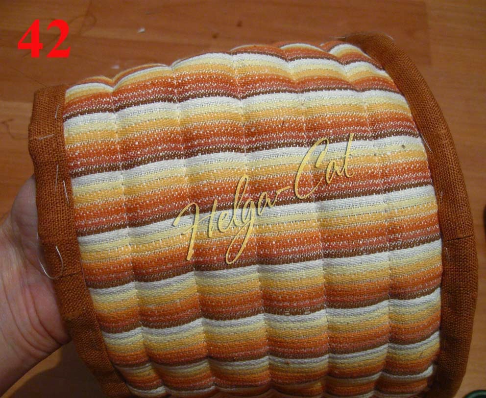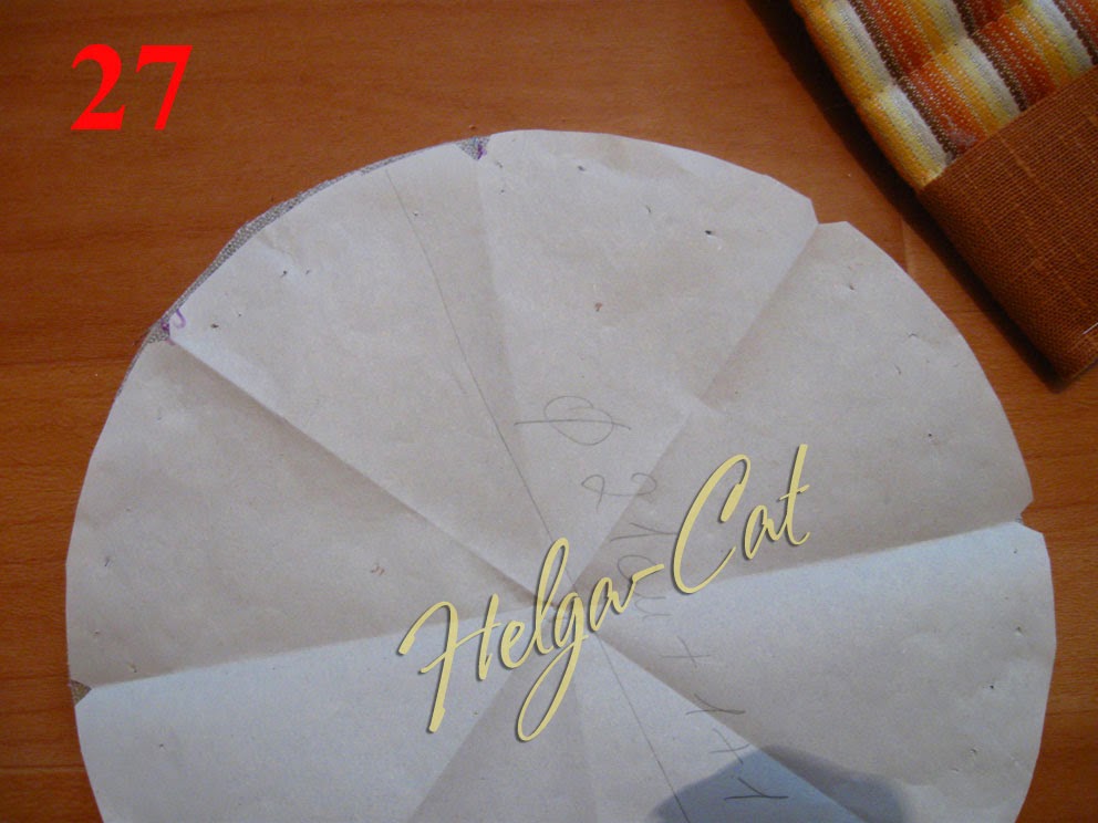 26. Прежде, чем кроить донышко, надо сложить кольцо-стенку вдвое и измерить длину, умножить полученную цифру на два и проверить – не изменилась ли она по сравнению с первоначальными планами. Если изменилась – сделать корректировку для донышка: длину окружности, полученную при измерении заготовки, поделить на 3,14 – и получить новый диаметр дна.)))) Из стёганого квадрата вырезать круг диаметром 23 см – 21 плюс по одному см на припуски швов.