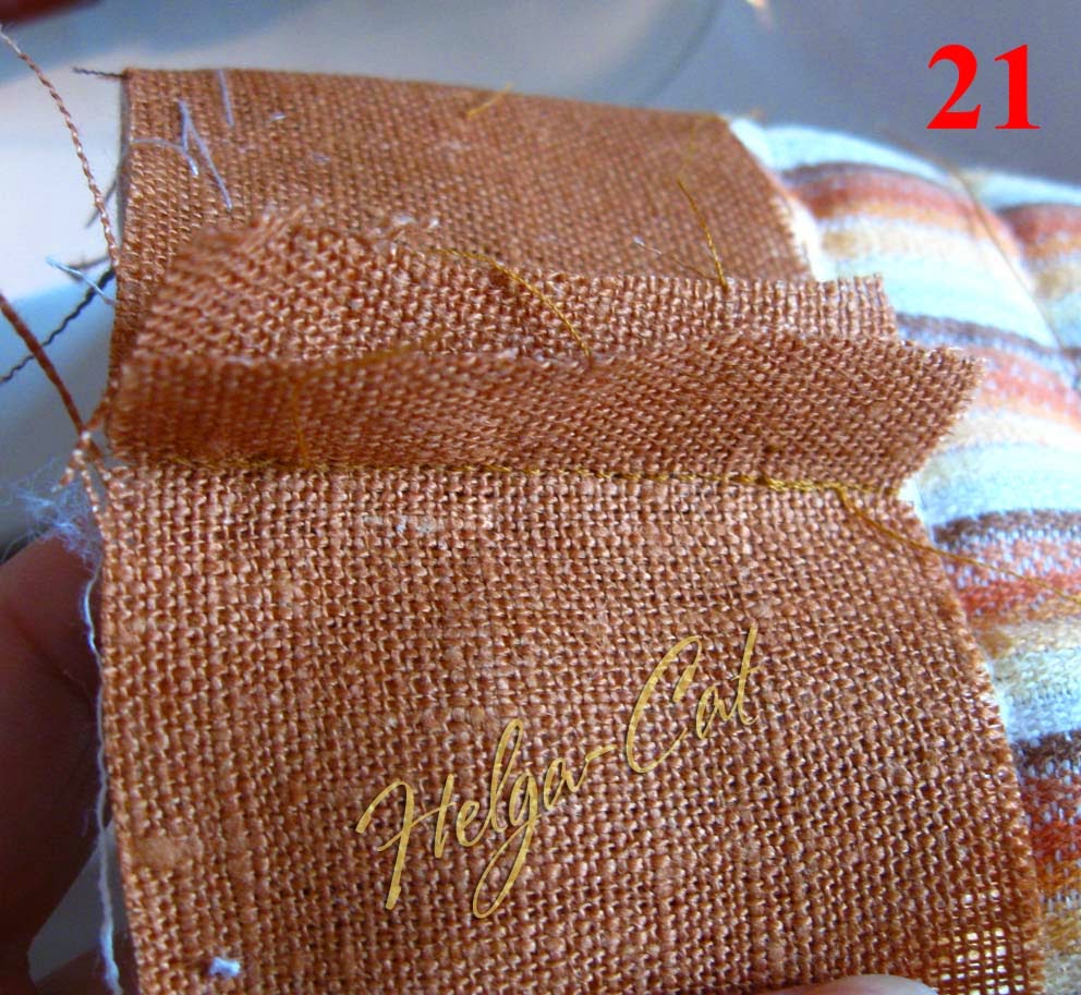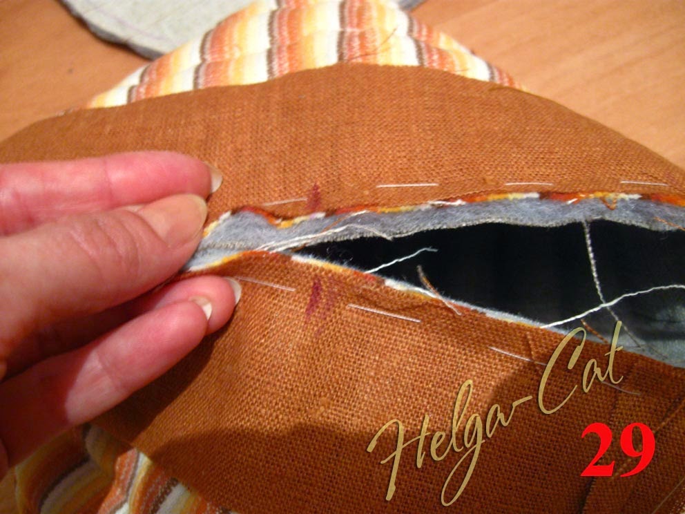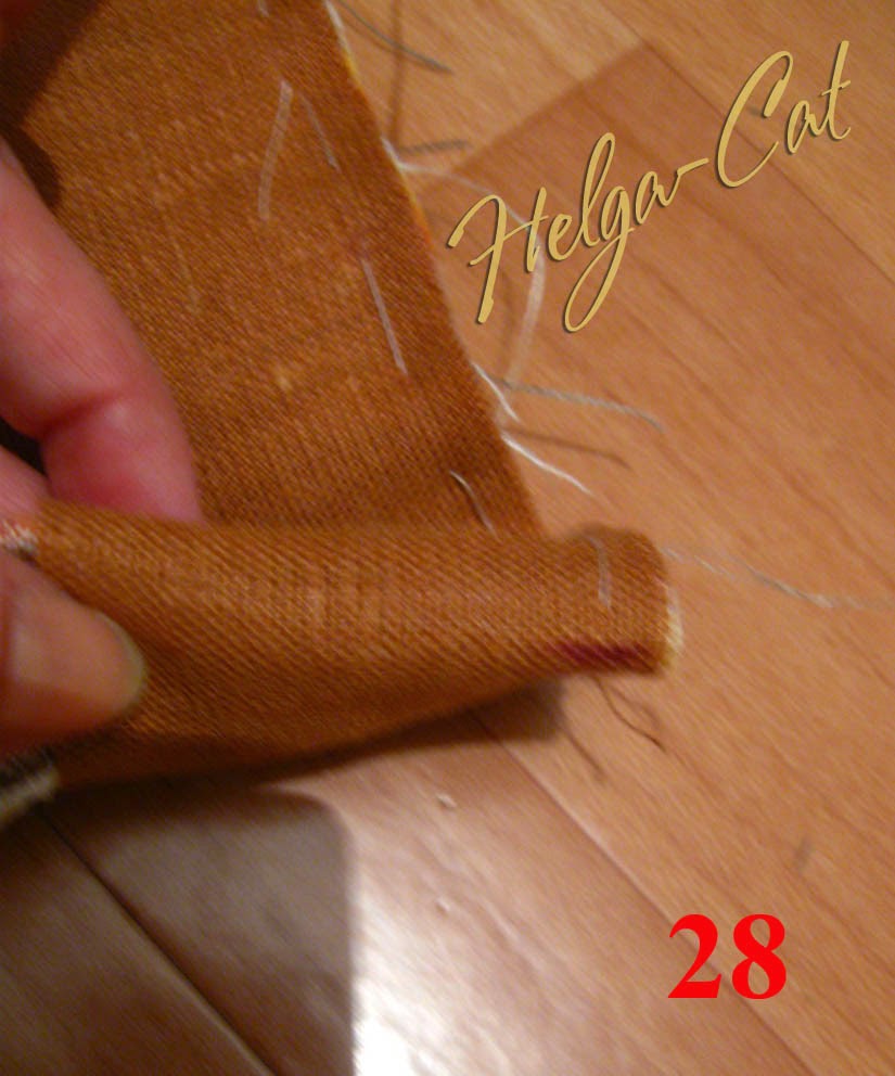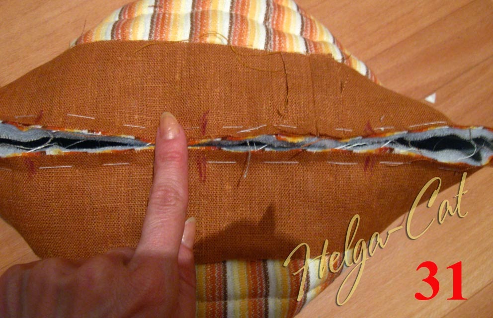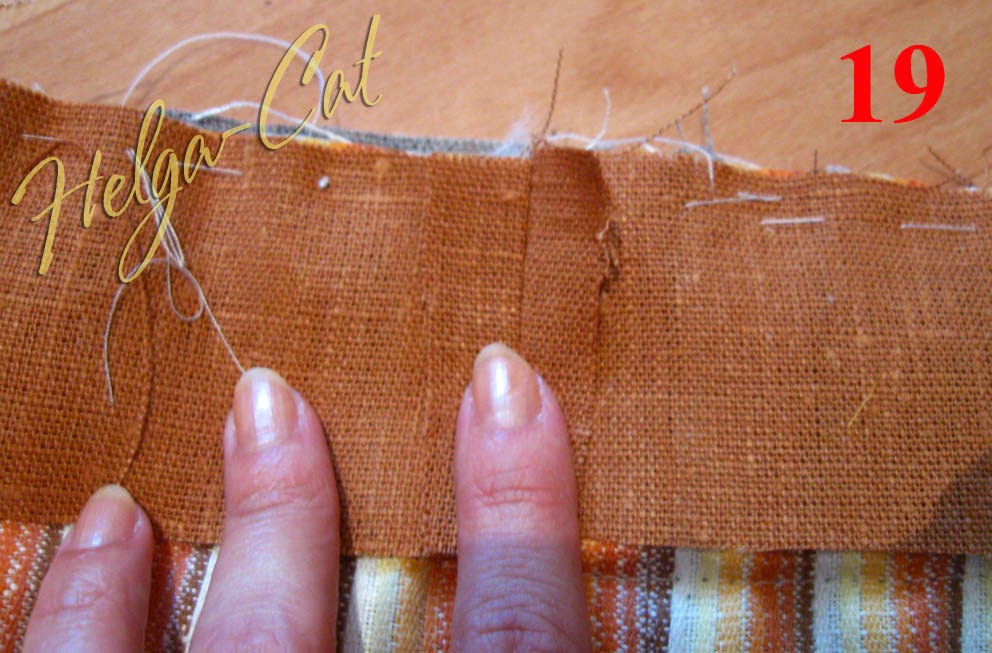 23. Приметать отделочную полоску до конца к верхнему краю основы. У меня получилось два шовчика, потому что размер коричневой ткани уже не позволят выкроить одну полоску необходимой длины, пришлось добавлять кусочками.